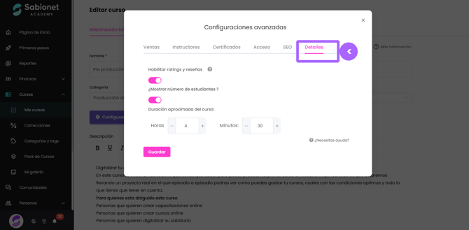 Dirígete a la visita de edición de tu curso, luego haz clic en configuraciones Avanzadas, una vez aquí, selecciona la pestaña "Detalles"