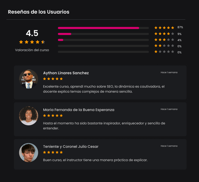 Debajo del banner de cada uno de tus cursos, aparecerá la cantidad de reviews: