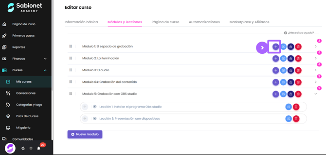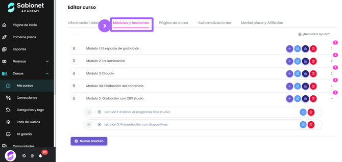 Paso 1: Ingresa a la pestaña de Módulos y Lecciones de tu curso