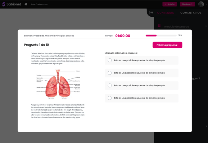 Puedes asociar cada pregunta a un módulo y lección específicos del curso, lo que permite brindar contexto al estudiante sobre en qué parte del contenido se abordó ese tema. Esta funcionalidad también facilita una evaluación más estructurada y coherente con el avance del curso, y te ayudará a obtener estadísticas más detalladas.