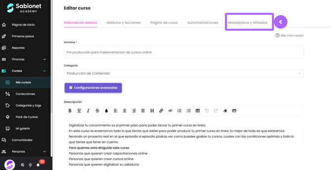 Paso 1: Dirígete a la vista donde editas tu curso, y haz clic sobre la pestaña "Marketing y Afiliados"