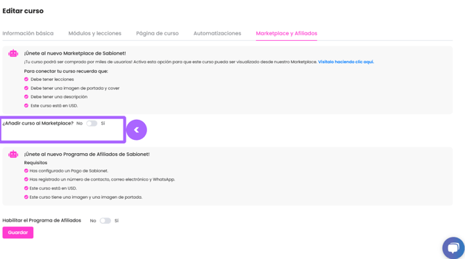 Paso 2: Añade tu curso al Marketplace, habilitando primero esta opción