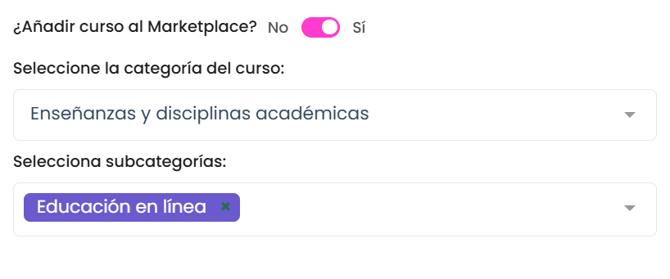Paso 3: Una vez habilitada la opción, aparecerán dos nuevos campos para que selecciones la categoría y subcategoría de tu curso: