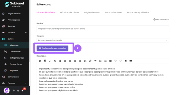 Paso 1: Accede a la sección de edición del curso y haz clic en el botón de configuraciones avanzadas: